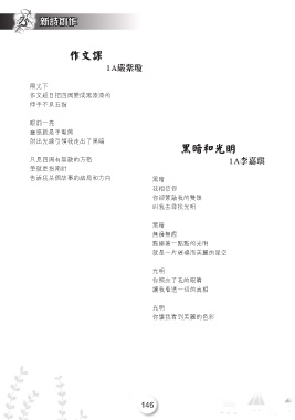 新詩創作 作文課 1A嚴紫瓊 陽光下 作文題目把四周變成黑漆漆的 伸手不見五指 眼前一亮 靈感就是手電筒 射出光線引領我走出了黑暗 黑暗和光明 只見四周有無數的方格 1A李嘉琪 筆就是指南針 告訴我某個故事的結局和方向 黑暗 我相信你 你卻蒙蔽我的雙眼 叫我去尋找光明 黑暗 無邊無際 點綴著一點點的光明 就是一片璀璨而美麗的星空 光明 你照亮了我的眼睛 讓我看透一切的真相 光明 你讓我看到美麗的色彩 146