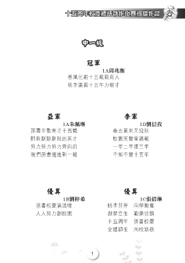 十五周年校慶標語創作比賽得獎作品 中一級 冠軍 1A邱兆衡 春風化雨十五載勤育人 桃李滿園十五年力樹才 亞軍 季軍 1A朱佩琳 1D劉信孜 孫書辛勤育才十五載 春去夏來又迎秋 師長默默耕耘出英才 校園笑聲常滿載 努力努力努力齊向前 一年二年復三年 我們孫書邁進新一載 不知不覺十五年 優異 優異 1B劉梓希 1C張倩琳 孫書校慶滿溫暖 桃李芬芳 向學勤奮 人人努力創校園 創傑立生 勤廉信慎 十五周年 孫書校慶 全體師生 向校致敬 1