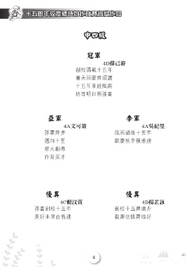 十五周年校慶標語創作比賽得獎作品 中四級 冠軍 4D蘇己游 創校滿載十五年 普天同慶齊頌讚 十五年來經風雨 終等明日照孫書 亞軍 季軍 4A文可盈 4A吳紀瑩 孫書齊步 風雨過後十五年 邁向十五 歡慶桃李獲連連 薪火相傳 作育英才 優異 優異 4C賴汶萱 4D楊芷詠 孫書創校十五年 創校十五齊邁步 美好未來由我建 勤廉信慎齊做好 4
