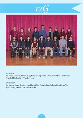 12G Back Row: Ms Sarah Gerlach, Emerald Sy, Hedy Wang, Kevin Kwok, Caleb Lei, Keith Chau, Annabel Harb, Alana Tse, Jesy Lau Front Row: Stephanie Chan, Heather Liu, Naomi Tse, Natalie Lee, Nelson Chu, Linus Yu, Ryan Tsang, Marco Law, Jericarl Guo 122