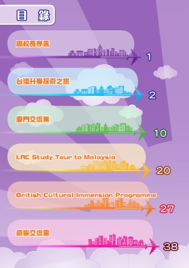 目錄 周校長序言 1 台灣升學探索之旅 2 廈門交流團 10 LAC Study Tour to Malaysia 20 British Cultural Immersion Programme 27 遼寧交流團 38