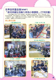 世界自然基金會(WWF) 「將可持續生活納入本地小學課程」(三年計劃) 「將可持續生活納入本地小學課程」提供漸進式的學習歷程,採用「全校參與」形式, 包含教師訓練、學生活動和校本環保活動。學習目的是讓學生認識人類與自然資源的關聯及 「生態足印」概念,讓學生明白自己是地球上重要的一員,並從生活細節着手,活出可持續 生活模式,積極保育自然環境和善用資源。 核心教育活動 一年級 動物嘉年華 二年級 大自然之旅 三年級 步走家族 四年級 資源獎門人 五年級 3.9個地球 六年級 我是主人翁 52