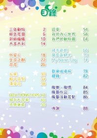 目錄 三色動物 2 四季 54 拼色花園 6 我的內心世界 58 彩紙編織 10 我們的動物園 64 大吉大利 14 城市面貌 66 外星人 18 葡萄與蝸牛 70 生命之樹 22 My Name Tag 74 荷花 26 創意咖啡杯 78 水果 30 櫻桃 82 帽子派對 34 漢堡包 38 陶樂.陶情 84 陶藝作品 85 BOX MONSTERS 42 陶藝活動花絮 86 城市大合奏 46 魚樂無窮 50 鳴謝 88 1