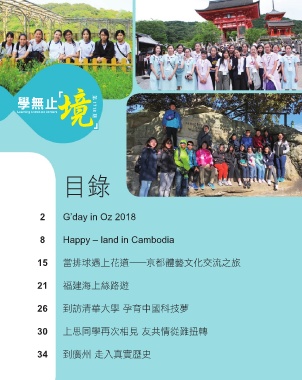 1 境 「 學無止 第 Learning knows no borders 」 1718 期 目錄 2 G’day in Oz 2018 8 Happy – land in Cambodia 15 當排球遇上花道——京都體藝文化交流之旅 21 福建海上絲路遊 26 到訪清華大學 孕育中國科技夢 30 上思同學再次相見 友共情從難扭轉 34 到廣州 走入真實歷史