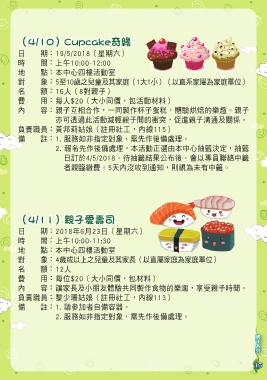 內 容 :讓家長及小朋友體驗共同製作食物的樂趣,享受親子時間。