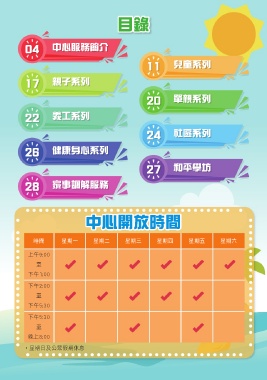 目錄 04 中心服務簡介 11 兒童系列 17 親子系列 20 單親系列 22 義工系列 24 社區系列 26 健康身心系列 27 和平學坊 28 家事調解服務 中心開放時間 時間 星期一 星期二 星期三 星期四 星期五 星期六 上午9:00 至 下午1:00 下午2:00 至 下午5:30 下午5:30 至 晚上8:00 ˙星期日及公眾假期休息