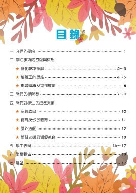 目錄 一. 我們的學校 1 二. 關注事項的成就與反思 ★ 優化校本課程 2~3 ★ 培養正向思維 4~5 ★ 提昇領導及協作效能 6 三. 我們的學與教 7~9 四. 我們對學生的成長支援 ★ 宗教教育 10 ★ 德育及公民教育 11 ★ 課外活動 12 ★ 學習支援及資優教育 13 五. 學生表現 14~17 六. 財務報告 18 七. 展望 17