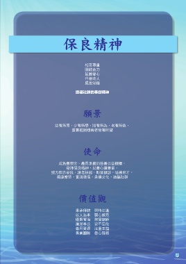 保良精神 相互尊重 團結合力 延展愛心 行善助人 感恩知德 造福社群的奉獻精神 願景 幼有所育,少有所學,壯有所為,老有所依, 貧寡孤困殘病者皆有所望 使命 成為最傑出、最具承擔的慈善公益機構, 發揮保良精神,以善心建善業, 致力保赤安良,護老扶弱,助貧健診,培德育才, 揚康樂眾,實踐環保,承傳文化,造福社群 價值觀 秉承傳統 與時並進 以人為本 關心感恩 優良管治 務實創新 廉潔奉公 安不忘危 善用資源 注重本益 專業團隊 愛心服務 3