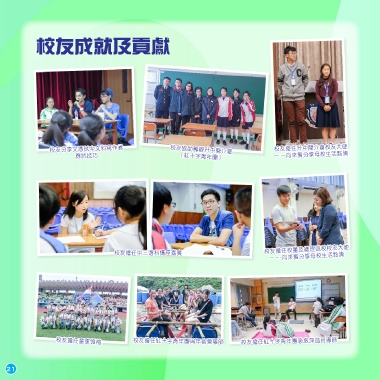 校友成就及貢獻 校友分享文憑試中文科寫作卷 校友協助籌辦升中簡介會 校友擔任升中簡介會校友大使 應試技巧 (紅十字青年團) ─向來賓分享母校生活點滴 校友擔任校董及總理巡校校友大使 校友擔任中三選科講座嘉賓 ─向來賓分享母校生活點滴 校友擔任童軍領袖 校友擔任紅十字青年團周年宿營導師 校友擔任紅十字青年團急救深造班導師 21