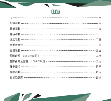 目錄 序 一 訓練活動 四 露營活動 九 繩結活動 二一 遠足活動 二五 童軍大會操 三二 服務活動 三五 團隊合照(2000年以前) 三七 團隊合照及宣誓(2001年以後) 三九 歷史圖片 四三 聯誼活動 四五 花絮及剪影 四八
