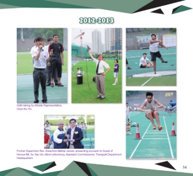 2012-2013 Oath taking by Athlete Representative, Chan Ho Yin Former Supervisor Rev. Areechira Mathai James, presenting souvenir to Guest of Honour Mr. Su Yau On, Albert (Alumnus), Assistant Commissioner, Transport Department Headquarters 34