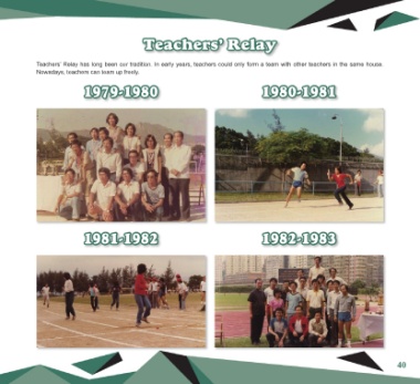 Teachers’ Relay Teachers’ Relay has long been our tradition. In early years, teachers could only form a team with other teachers in the same house. Nowadays, teachers can team up freely. 1979-1980 1980-1981 1981-1982 1982-1983 40