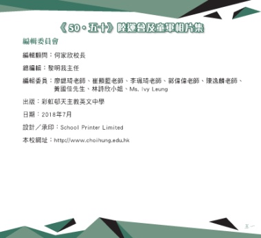 《 50 • 五十》陸運會及童軍相片集 編輯委員會 編輯顧問:何家欣校長 總編輯:黎明我主任 編輯委員:廖鍶琦老師、崔顥藍老師、李珮琦老師、郭偉偉老師、陳逸麟老師、 黃國佳先生、林詩欣小姐、Ms. Ivy Leung 出版:彩虹邨天主教英文中學 日期:2018年7月 設計/承印:School Printer Limited 本校網址:http://www.choihung.edu.hk 五一
