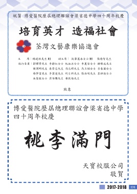 祝賀 博愛醫院歷屆總理聯誼會梁省德中學四十周年校慶 培育英才 造福社會 荃灣文藝康樂協進會 主 席:楊建林先生 MH 副主席: 阮黎麗冰女士 MH 張德智先生 執行委員:劉耀榮先生 李靜紅女士 阮淑冰女士 李麗容女士 鍾佛成先生 謝潤明先生 秦偉忠先生 馮志輝先生 馬玉娟女士 呂春蘭女士 蔡學富先生 李霖達先生 何日新先生 張浩明先生 袁梓瑜女士 朱慧敏女士 梁伯聰先生 黃啟倫先生 致意 博愛醫院歷屆總理聯誼會梁省德中學 四十周年校慶 桃李滿門 天寶校服公司 敬賀 2017-2018 131