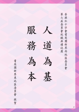 第 香港紅十字會耆英團 七 服務為本 人道為基 屆委員會就職典禮誌慶 新界西 地區委員會 耆英團 新界東 地區委員會 敬賀 21