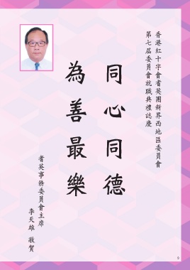 第 香港紅十字會耆英團 七 為善最樂 同心同德 屆委員會就職典禮誌慶 新界西 地區委員會 耆英事務委員會主席 李天雄 敬賀 9