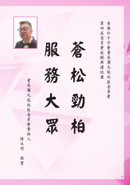 第四屆委員會就職典禮誌慶 香港紅十字會耆英團九龍地區委員會 服務大眾 蒼松勁柏 耆英團九龍地區委員會贊助人 陳永明 敬賀 13