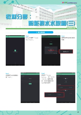 STEM @LCP Makerspace 教材分享: 智能換水水族箱(三) 陳瑋麟老師 1. 建立新專案 Step1. Step2. 於App中選擇「Create 選擇我們所使用的微控 New Project」 制器。 Step3. Step4. 連線模式為無線網絡, 最後到「Project 選「WiFi」 Setting」,把「AUTH TOKENS」電郵或複 製,留待於編程時把 App與硬件配對 29