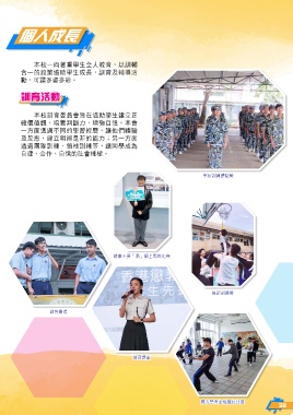 個人成長 ͉ࣧɓΣഹࠠኪ͛Όɛԃd˸Ⴞ Υɓٙ݁ഄпኪ͛ϓڗdԃʿႾኬݺ ਗd̙ፗε۶εf 訓育活動 ͉ࣧԃ։ࡰึϙίпኪ͛ܔ͍ͭ ᆽᄆ࠽ᝈdቮкᓙɢdᄣ੶Іڦf͉ึ ɓ˙ࠦீཀʔΝٙኪ୦ዝdᜫ˼ࡁ᜕ ʿˀܠdܔͭ፫݊ڢٙঐɢi̤ɓ˙ࠦ ீཀྠඟᇖeჯஙᇖഃdᜫΝኪϓމ ІܛeΥЪeІڦٟٙึಊᆃf 軍校訓練體驗營 健康不要「酒」網上問答比賽 風紀訓練營 訓育劇場 教育講座 陽光禁毒全能競技比賽 39