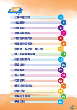 目錄 法團校董玉照 4 校監題辭 5 校長的話 6 榮休校長專訪 7 校政委員會成員 8 榮休副校長專訪 9 家教會、校友會、學生會 10 四十五載大事回顧 11 啟發潛能教育 19 靈命培養 23 學術追求 26 個人成長 39 社會參與 55 學生活動及成就 70 校慶花絮 82 教職同工合照 93 學生合照 95 3