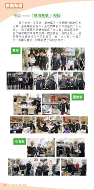 校園點滴 中二 —「感同身受」活動 除了校長、老師外,學校還有一班默默付出的工作 人員,支撐學校的運作,是我們學校不可或缺的「大人 物」。為了讓學生更體會這些「大人物」的工作苦樂, 並了解求職的準備及困難,因此特設「感同身受」,讓 同學可以應徵校內不同的崗位,跟「大人物」一起工 作,有趣又難忘,同學經歷了深刻的時光。 更亭 圖書館 小食部 22 自律承責 兼容互信