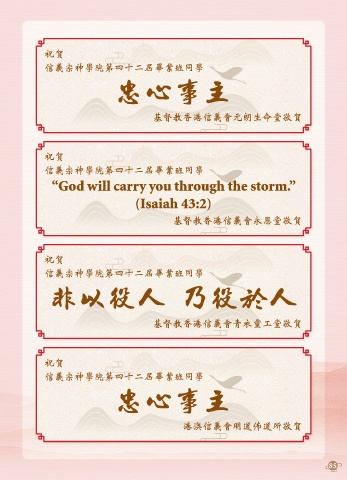 祝賀 信義宗神學院第四十二屆畢業班同學 忠心事主 基督教香港信義會元朗生命堂敬賀 祝賀 信義宗神學院第四十二屆畢業班同學 “God will carry you through the storm.” (Isaiah 43:2) 基督教香港信義會永恩堂敬賀 祝賀 信義宗神學院第四十二屆畢業班同學 非以役人 乃役於人 基督教香港信義會青衣靈工堂敬賀 祝賀 信義宗神學院第四十二屆畢業班同學 忠心事主 港澳信義會明道佈道所敬賀 85