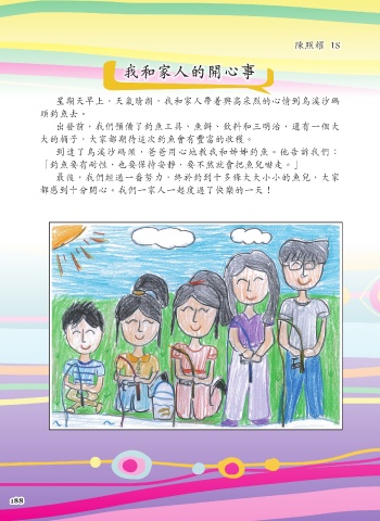 陳照耀 1S 我和家人的開心事 星期天早上,天氣晴朗,我和家人帶着興高采烈的心情到烏溪沙碼 頭釣魚去。 出發前,我們預備了釣魚工具、魚餌、飲料和三明治,還有一個大 大的桶子,大家都期待這次釣魚會有豐富的收穫。 到達了烏溪沙碼頭,爸爸用心地教我和姊姊釣魚。他告訴我們: 「釣魚要有耐性,也要保持安靜,要不然就會把魚兒嚇走。」 最後,我們經過一番努力,終於釣到十多條大大小小的魚兒,大家 都感到十分開心。我們一家人一起度過了快樂的一天! 188