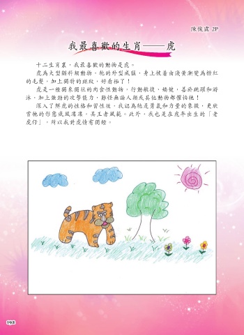 陳俊霖 2P 我最喜歡的生肖—虎 十二生肖裏,我最喜歡的動物是虎。 虎為大型貓科類動物,牠的外型威猛,身上披着由淺黃漸變為橙紅 的毛髮,加上獨特的斑紋,好看極了! 虎是一種獨來獨往的肉食性動物,行動敏捷、矯健,善於跳躍和游 泳,加上強勁的攻擊能力,難怪無論人類或其他動物都懼怕牠! 深入了解虎的性格和習性後,我認為牠是勇氣和力量的象徵,更欣 賞牠的形態威風凜凜,具王者風範。此外,我也是在虎年出生的「老 虎仔」,所以我對虎情有獨鍾。 192