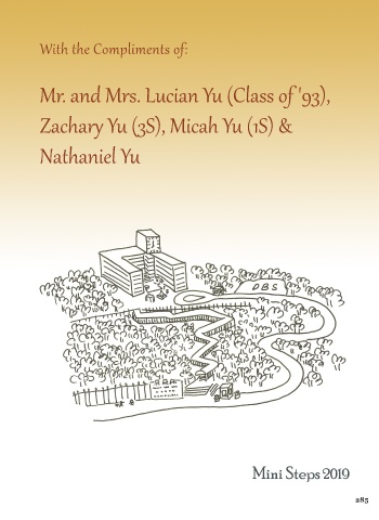 With the Compliments of: Mr. and Mrs. Lucian Yu (Class of '93), Zachary Yu (3S), Micah Yu (1S) & Nathaniel Yu 285