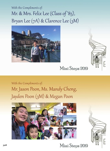 With the Compliments of: Mr. & Mrs. Felix Lee (Class of '85), Bryan Lee (7A) & Clarence Lee (3M) With the Compliments of: Mr. Jason Poon, Ms. Mandy Cheng, Jayden Poon (3M) & Megan Poon 328