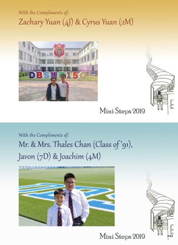 With the Compliments of: Zachary Yuan (4J) & Cyrus Yuan (2M) With the Compliments of: Mr. & Mrs. Thales Chan (Class of '91), Javon (7D) & Joachim (4M) 335