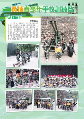黃埔青少年軍校訓練營 活動簡介 鍾嘉蓮主任 2019年1月9日至11日,40位三至五年級同學 參加了三日兩夜之「黃埔青少年軍校訓練營」, 同學透過不同的訓練活動,例如:軍事訓練、佇 列訓練、操練軍體拳、乘坐水陸裝甲車、彩彈對 抗訓練、百米障礙訓練及歷奇訓練等,學會嚴守 紀律及與人合作,建立團體精神,更學習如何照 顧自己及解決問題。雖然在訓練過程中困難重 重,但同學都能明白紀律的重要,並學懂自理的 技巧,實在獲益良多! 16