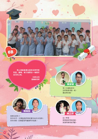 6B 衷心祝願畢業在即的同學們用 智慧、膽略、毅力開闢出一塊屬於 自己的土地。 6B班主任 施純純老師 陳家榮 我十分感謝老師, 您們就像明燈一樣, 護送我前進。 陳樂殷 陳芷妍 畢業已經到了, 與你同行,回想起我們曾經擁有過共同理想; 這六年裏, 與你分開,回憶着我們重逢時的狂歡。 謝謝老師們的教導, 謝謝同學們的照顧。 13