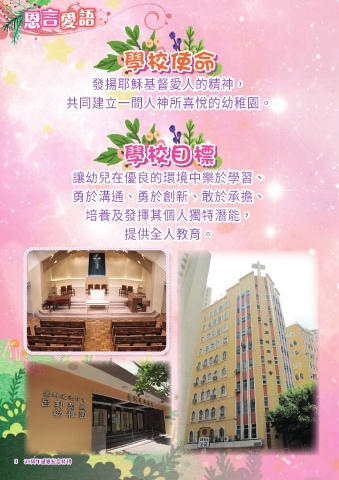 恩 言 愛 語 學校使命 發揚耶穌基督愛人的精神, 共同建立一間人神所喜悅的幼稚園。 學校目標 讓幼兒在優良的環境中樂於學習、 勇於溝通、勇於創新、敢於承擔、 培養及發揮其個人獨特潛能, 提供全人教育。 3 36周年感恩紀念特刊