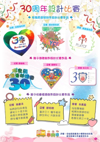 30周年設計比賽 教職員徽號創作設計比賽作品 冠軍 梁寶儀老師 亞軍 周培蓉老師 季軍 黃麗瑩老師 親子徽號創作設計比賽作品 冠軍 陳晙晧 亞軍 潘樂兒 季軍 林允兒 親子校慶標語創作設計比賽作品 冠軍 施書泳 季軍 朱嘉盈 保育幼兒品德良 亞軍 鄭柏翹 保良樂傳薪 建校三十來不易 喜迎三十 攜手喝采 服務社群逾世紀 春風化雨恩滿澤 師生同心 共創未來 澤峯勤誨學 師生攜手創高峯 春風化雨三十年 評審︰保良局陸慶濤小學陳桂琼校長 資深音樂工作者韋然先生 12