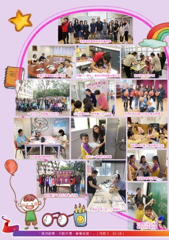 家委協助舉辦家長校董選舉 家委成員籌備迎月夜活動 照顧小一學生,協助他們適應校園生活 為表演生裝扮一番 一起出發,帶領學生去旅行 全方位學習日,家長義工全力以赴 利用利是封製作花燈去佈置家居 協助帶領活動,幫助學生成長 協助圖書館處理事宜 協助小一適應在校午餐 協助檢查學生儀容 協助推行「書包必瘦站」活動 協助校務工作,分發通告 在清潔日當天教導 學生如何清潔校園 「應常歡樂,不斷祈禱,事事感謝。」(得前 5:16-18)