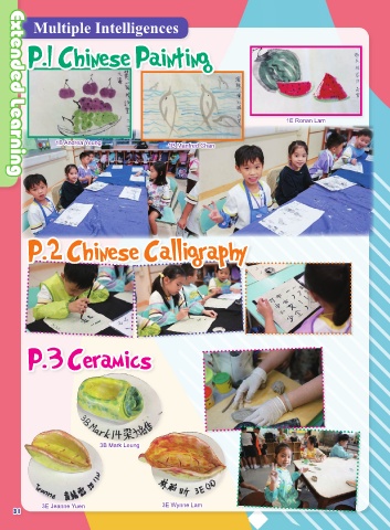 Multiple Intelligences P.1 Chinese Painting 1E Ronan Lam 1B Andrea Yeung 1B Manfred Chan Extended Learning P.2 Chinese Calligraphy P.3 Ceramics 3B Mark Leung 3E Jeanne Yuen 3E Wynne Lam 31