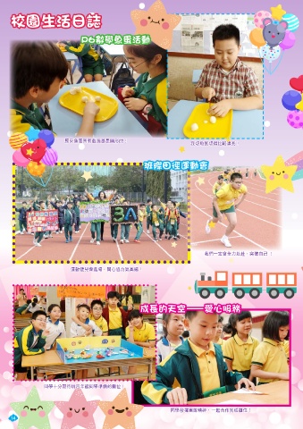 校園生活日誌 P6數學魚蛋活動 原來魚蛋所有截面都是圓形的! 我切魚蛋切得比較漂亮! 班際田徑運動會 我們一定會全力以赴,突破自己 ! 運動健兒齊進場,同心協力氣高揚! 成長的天空—愛心服務 同學十分期待玩四年級同學準備的攤位! 同學發揮團隊精神,一起合作完成攤位! 14