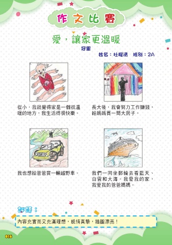 作 文 比 賽 愛,讓家更溫暖 冠軍 姓名:杜耀清 班別:2A ʃdҢఱᙂ݊ɓࡈܘ ڗɽܝdҢึрɢʈЪᒃ፺d าٙή˙dҢ͛ݺܘҞᆀf ഗ൯ɓගɽגɿf Ңɰซഗهه൯ɓሿ൳ԓf ҢࡁɓΝѬඉቃ̘ᔝ˂e ͣථձɽऎfҢฌҢٙd ҢฌҢٙههf 評語: ʫ࢙̂ྼϾɦ̂တଣซdชઋॆᅚdౢྡဎڥl 016