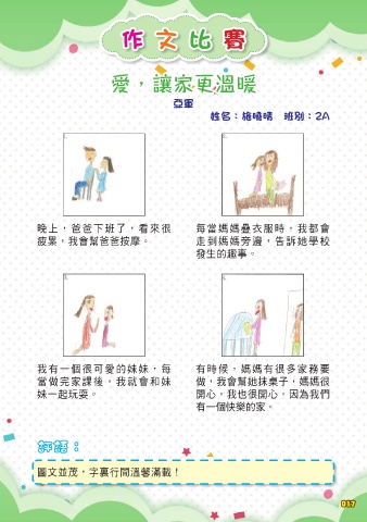 作 文 比 賽 愛,讓家更溫暖 亞軍 姓名:施曉晴 班別:2A ૉɪdههɨफədԸܘ ӊᛌВࣛdҢேึ हଢ଼dҢึᏍههܲᅙf ԐՑࣙᗙdѓൡμኪࣧ ೯͛ٙሳԫf ҢϞɓࡈܘ̙ฌٙ֊֊dӊ ϞࣛࡉdϞܘεਕࠅ ਂҁሙܝdҢఱึձ֊ ਂdҢึᏍμכࣲɿdܘ ֊ɓৎِߘf කːdҢɰܘකːdΪމҢࡁ ϞɓࡈҞᆀٙf 評語: ྡ˖Ԩ߱dο㛪Бගᙚတ༱l 017