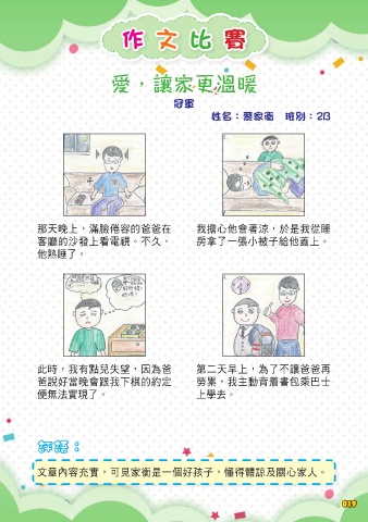 作 文 比 賽 愛,讓家更溫暖 冠軍 姓名:蔡家衡 班別:2B ԟ˂ૉɪdတᑕ࠷࢙ٙههί Ңዄː˼ึഹ૭d݊Ңွ ܄ᝂٙӍ೯ɪཥൖfʔɮd גࣅəɓੵʃɿഗ˼ႊɪf ˼ᆞွəf ϤࣛdҢϞᓃՅ̰ૐdΪމه ୋɚ˂ϘɪdމəʔᜫههΎ هႭλૉึ༧Ңɨಒٙߒ֛ ௶ଢ଼dҢ˴ਗߠ䋠ࣣ̍࠱ˋɻ کೌجྼତəf ɪኪ̘f 評語: ˖ʫ࢙̂ྼd̙Ԉፅ݊ɓࡈλ܀ɿdᏑሓʿᗫːɛf 019