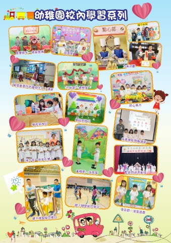 幼稚園校內學習系列 農曆新年—模擬舞獅 感恩節 方案活動 中秋節—提燈會 「做個盡責任的寵物主人」講座 開心果月 學校開放日 學校開放日 保護瀕危物種講座 端午節—齊來吃糭子 聖誕節感恩崇拜 重陽節—放風箏 親子體智能同樂日 復活節—滾蛋遊戲 親子體智能同樂日 6