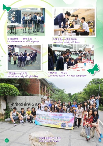 ʹගࠪᆀึ—ဂਨʃଡ଼ ʹගݺਗ—༟ৃ߅Ҧ߅ Lunchtime concert - vocal group Lunchtime activity - IT team ʹගݺਗ—ߵ˖߅ ʹගݺਗ—ʕ˖߅ Lunchtime activity - English Day Lunchtime activity - Chinese calligraphy ̨ᝄᐑڭᖵஔ˖ʷʘࣚ 14 ECOL Tour to Taiwan