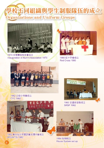 學校不同組織與學生制服隊伍的成立 Organizations and Uniform Groups 1973 ˖ଣࣣ৫ࣧʾึϓͭ Inauguration of Alumni Association 1973 1980 ߎɤοึϓͭ Red Cross 1980 1982 ʮूˇϋྠϓͭ CYC 1982 1982 ʹஷτΌඟϓͭ SRSP 1982 1982 රɽ̀ˇϋᙆৃึ˖ଣʱึϓͭ JPC(WTS) 1982 1984 ٟՓϓͭ House System set up 6