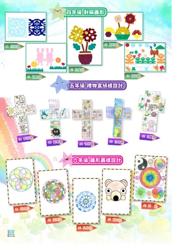 四年級 對稱圖形 4D 鄭可承 4A 利施穎 4C 杜樂兒 4B 劉思琪 4E 林道建 五年級 禮物盒紙樣設計 5A 李詠淇 5E 江蔓晴 5B 梁慧嫺 5D 沈晉希 5C 張晉賢 六年級 圓形圖樣設計 6E 林 錚 6A 蔡逸韵 6B 鄧樂瑤 6D 葉芷君 6C 吳思沂 40
