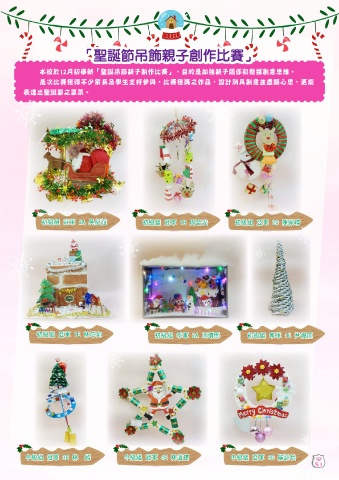 「聖誕節吊飾親子創作比賽」 本校於12月初舉辦「聖誕吊飾親子創作比賽」,目的是加強親子關係和發揮創意思維。 是次比賽獲得不少家長及學生支持參與,比賽獲獎之作品,設計別具創意並盡顯心思,更能 表達出聖誕節之氣氛。 初級組 冠軍 2A 吳紀誼 初級組 冠軍 1B 周晉安 初級組 亞軍 2C 陳家晴 初級組 亞軍 1E 林芯如 初級組 季軍 2A 馮靖熙 初級組 季軍 1E 尹焌匡 中級組 冠軍 3E 林 嫣 中級組 冠軍 4E 林道建 中級組 亞軍 3C 羅詠怡 51