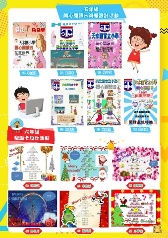 五年級 開心閱讀日海報設計活動 5A 李詠淇 5A 陳麒宇 5B 羅子恆 四年級 圖書封面設計活動 六年級 5D 陳家欣 5D 黃月怡 5E 吳建臻 聖誕卡設計活動 6A 林浩誠 6B 李德誠 6B 陳菲菲 6C 高名月 6D 梁昊銘 6E 馬夢璇 61