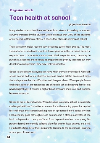 Stress to me is like motivation. When I studied in primary school, a classmate