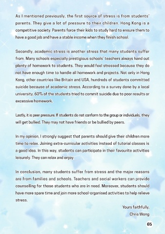 parents. They give a lot of pressure to their children. Hong Kong is a