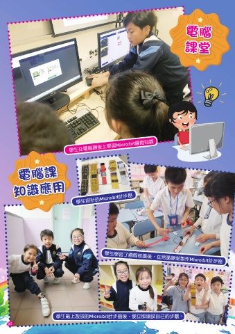 電腦 課堂 學生在電腦課堂上學習Micro:bit編程知識 電腦課 知識應用 學生設計的Micro:bit計步器 學生學習了編程知識後,在常識課堂製作Micro:bit計步器 學生戴上製成的Micro:bit計步器後,便立即測試自己的步數。 05
